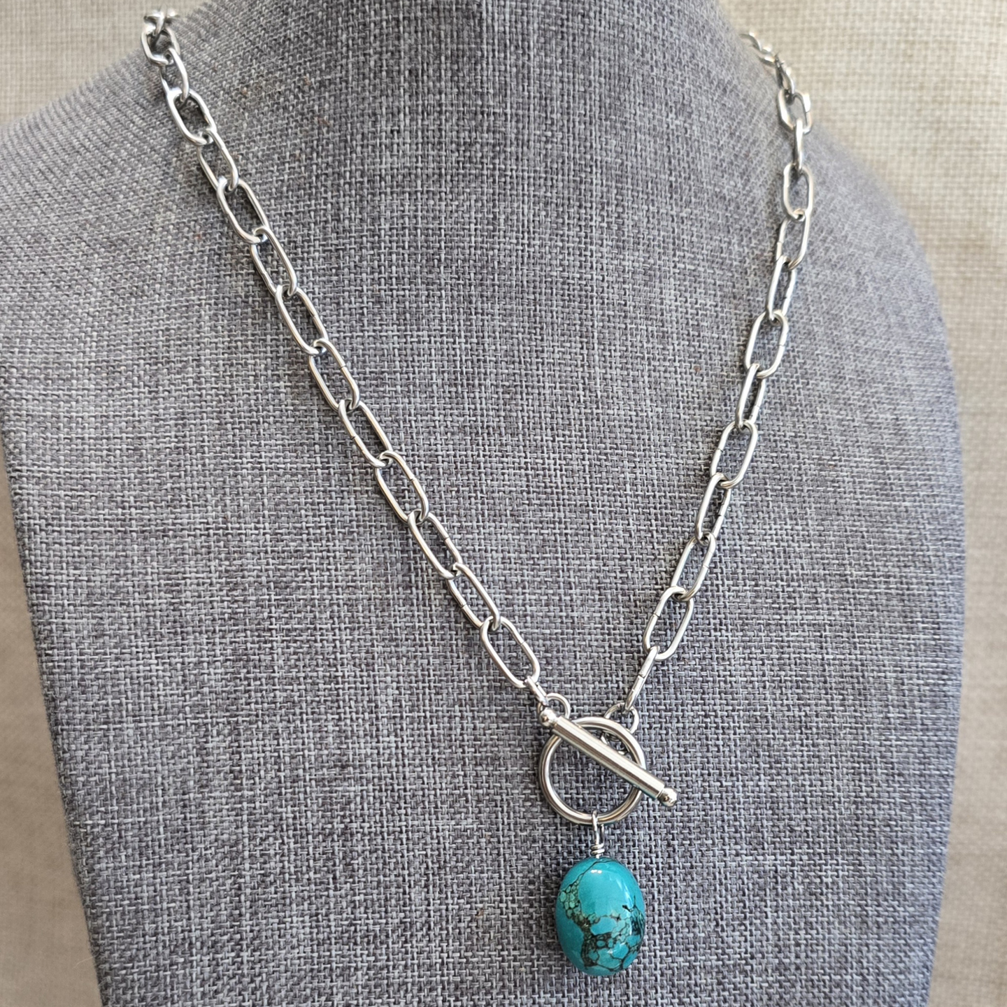 Genuine Arizona turquoise. Antiqued white brass pins. Stainless steel toggle. 18″ Stainless steel paperclip clain.